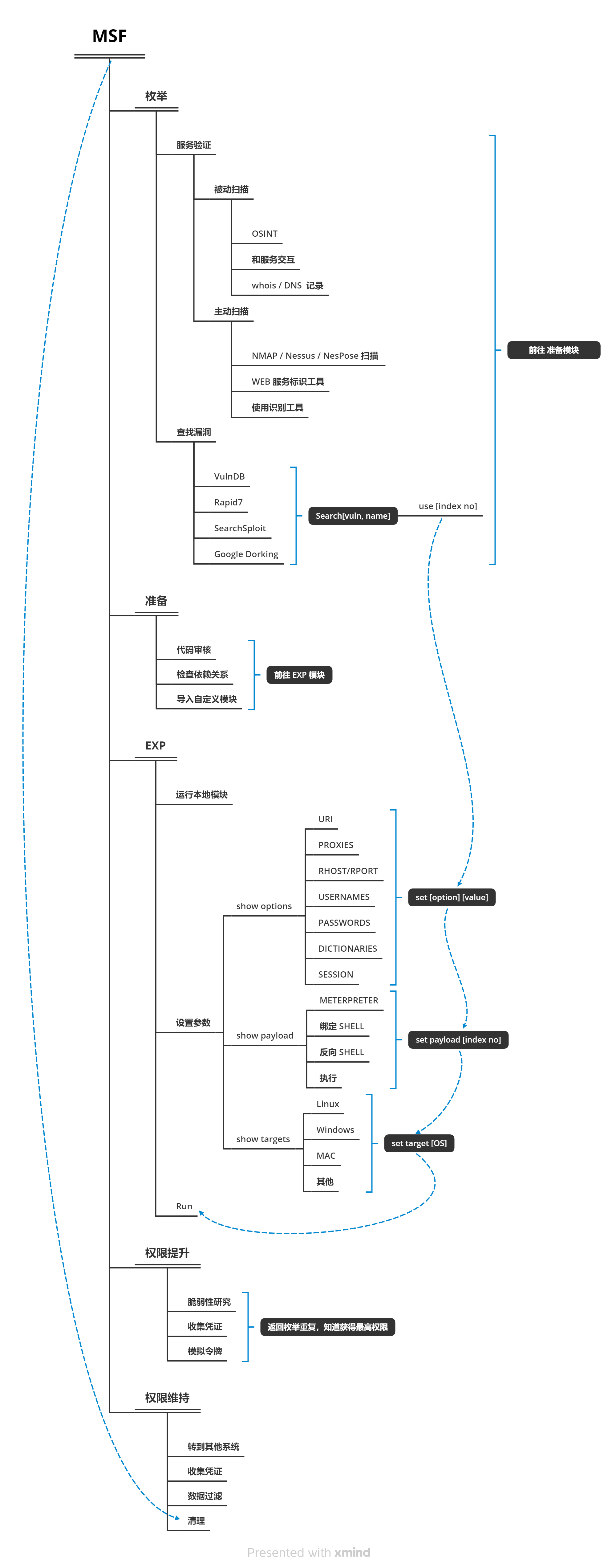 接口: 包括 msfconsole 控制终端、msfcli 命令行、msfgui 图形化界面、armitage 图形化界面 、msfapi 远程调用接口