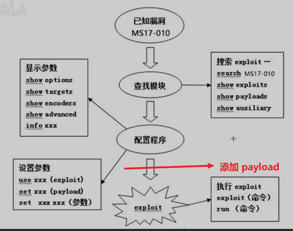 模块: 模块组织按照不同的用途分为六个类型的模块: 辅助模块(AUX)、渗透攻击模块(Exploits)、后渗透攻击模块(Post)、攻击载荷模块(payloads)、编码器模块(Encoders)、空指令模块(Nops)