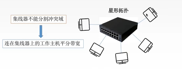 功能: 对信号进行再生放大转发,对衰减的信号进行放大,接着==转发到其他所有 (除输入端口之外)处于工作状态的端口上==,以增加信号传输的距离,延长网络长度。不具备信号的定向传送能力,是一个共享式设备